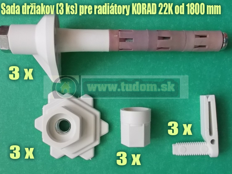Obsah balenia (pre 1 radiátor s dĺžkou 1800 mm / 180 cm alebo 2000 mm / 200 cm): - nástenný držiak (konzola) s plastovou hmoždinkou (3 ks) - dištančný (dolný) diel (opierka) (3 ks)