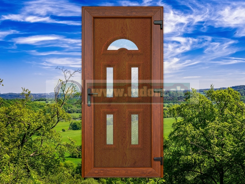 Plastové lacné domové vchodové dvere  so sklom: biele, zlatý, dub, dvojfarebné. Vchodové dvere do domu EUROPA 5 DP, plastové dvere: cenník, dovoz zadarmo, rozmery, predaj. Montážna sada zadarmo. tudom.sk